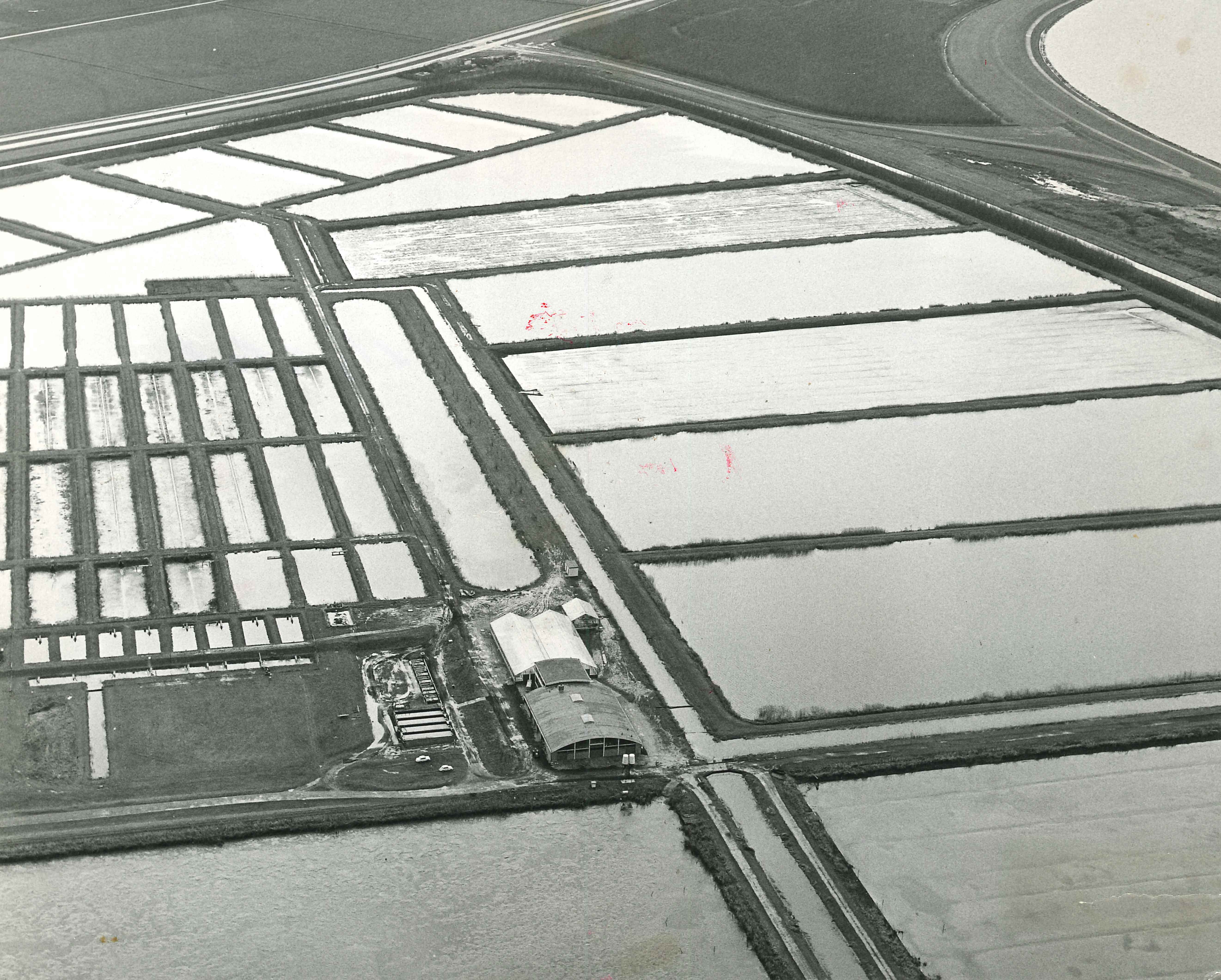 Luchtfoto van de voormalige OVB-viskwekerij nabij Lelystad.