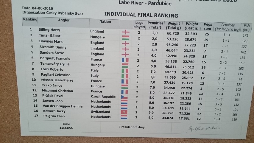 We hadden ook dag twee een gunstige loting, niet zozeer met de plaatsen maar meer met de tegenstanders stroomopwaarts. De Labe stroomde vandaag iets minder dan de vooraf gaande dagen. Dit had tot gevolg dat de vis in het begin kleiner was dan op dag 1. In vak A viste Tonny een gedegen debuut door als zesde te eindigen. Tonny wist de meeste vissen in zijn sector te vangen, maar helaas misten de grote vissen voor een topklassering. In vak B was het bij Joop het zelfde ook hij had de meeste vissen maar moest genoegen nemen met plaats 5 in de sector. Bij Henny in de sector liep het redelijk, maar ook hij kreeg de dikkere vis er pas het laatste uur op zijn stek en viste door dit laatste sterke uur een keurige derde plaats in de sector. Theo viste een sterke wedstrijd in het D vak en wist de gehele wedstrijd mooie vissen te vangen. Hierdoor eindigde hij op zeer nette vierde plaats in de sector. We konden op een goede tweede dag terug kijken en verbeterden ons met 1 punt ten opzichte van dag 1.