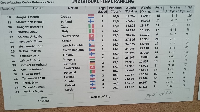 Het was dan ook wel teleurstellend dat we door de sterk vissende Italianen naar plaats vijf in de eindstand zijn verwezen. Al met al hebben we een week gehad met schitterende visserij en zijn we verslagen door een briljante Engelse ploeg.  We hebben echter een goed gevoel, wetende dat we ons kranig hebben geweerd. Sportvisserij Nederland heeft aangegeven dat de doelstelling is om bij de top vijf van wereld te horen. Dat is ons dit weekend gelukt. Helaas kwamen we iets te kort voor het podium.