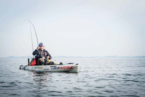 Behalve vanuit de boot wordt er ook vanuit de kajak en vanaf de kant gevist.