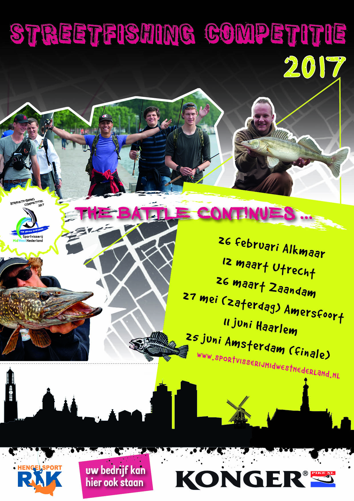 The battle continues… Na het grote succes van vorig jaar organiseert federatie Sportvisserij MidWest Nederland dit jaar weer een streetfishing competitie. Alkmaar, Utrecht, Zaandam, Amersfoort, Haarlem en Amsterdam zullen het strijdtoneel zijn van de competitie. Dit jaar zijn er uiteraard ook weer mooie prijzen te winnen en ligt er voor iedere deelnemer een goodiebag klaar.