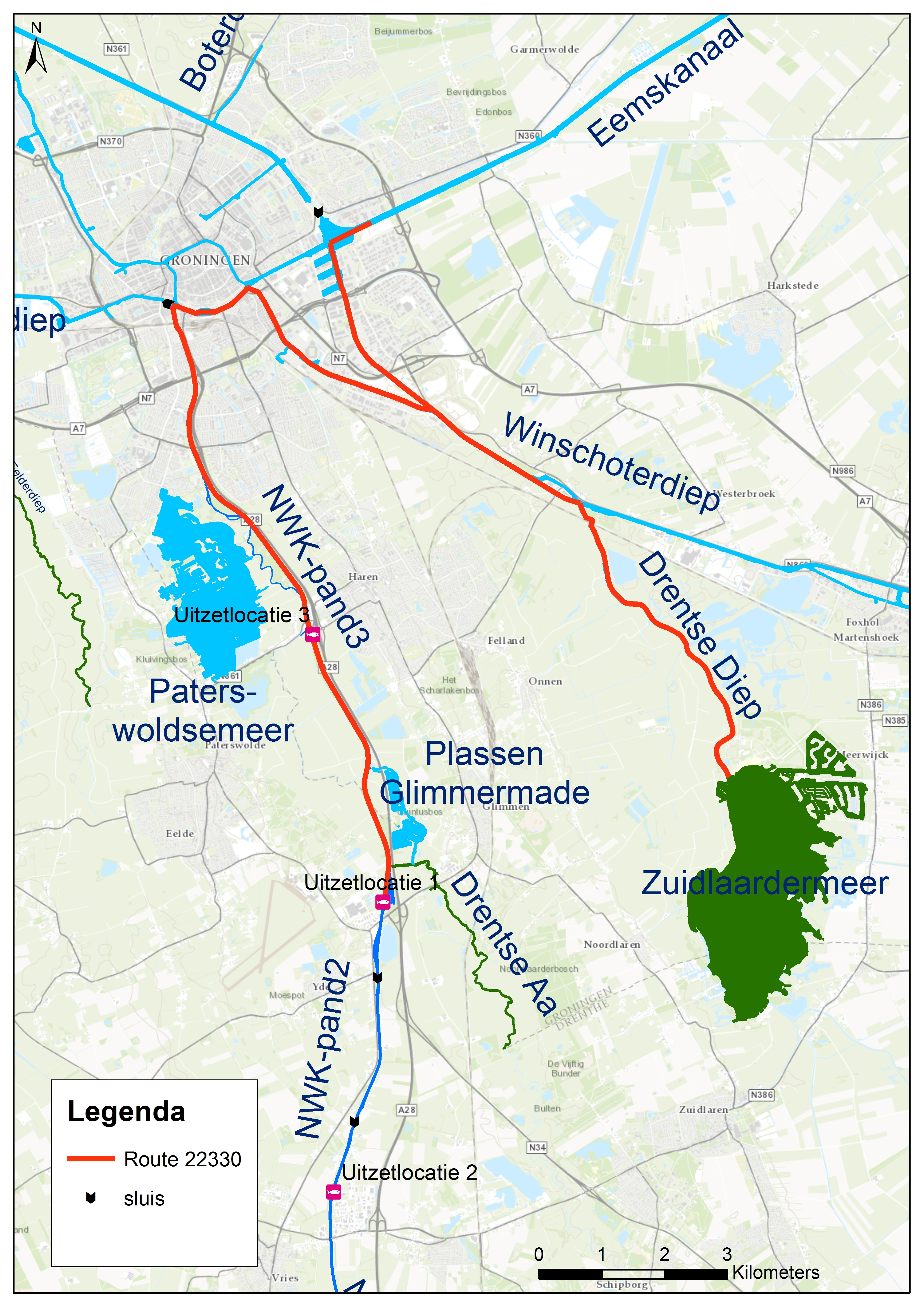 Een leuk voorbeeld van een migratieroute is vis nummer 22330. Deze vis is uitgezet in het Noord-Willemskanaal, en is vrij snel doorgezwommen naar het Zuidlaardermeer. Vervolgens is de vis gaan pendelen tussen dit meer en het kanaal waarbij behoorlijke afstanden worden afgelegd. De route is te zien op onderstaand kaartje.