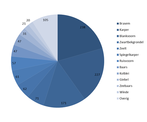 Tijdens de Week van Ons Water zijn er in MijnVISmaat door 264 gebruikers, 1158 vissen (40 verschillende soorten) geregistreerd, verspreid over 359 verschillende locaties in ons land. Onderstaande diagram geeft de verdeling weer van de meest gevangen vissoorten.