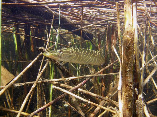 snoek beschut tussen de waterplanten