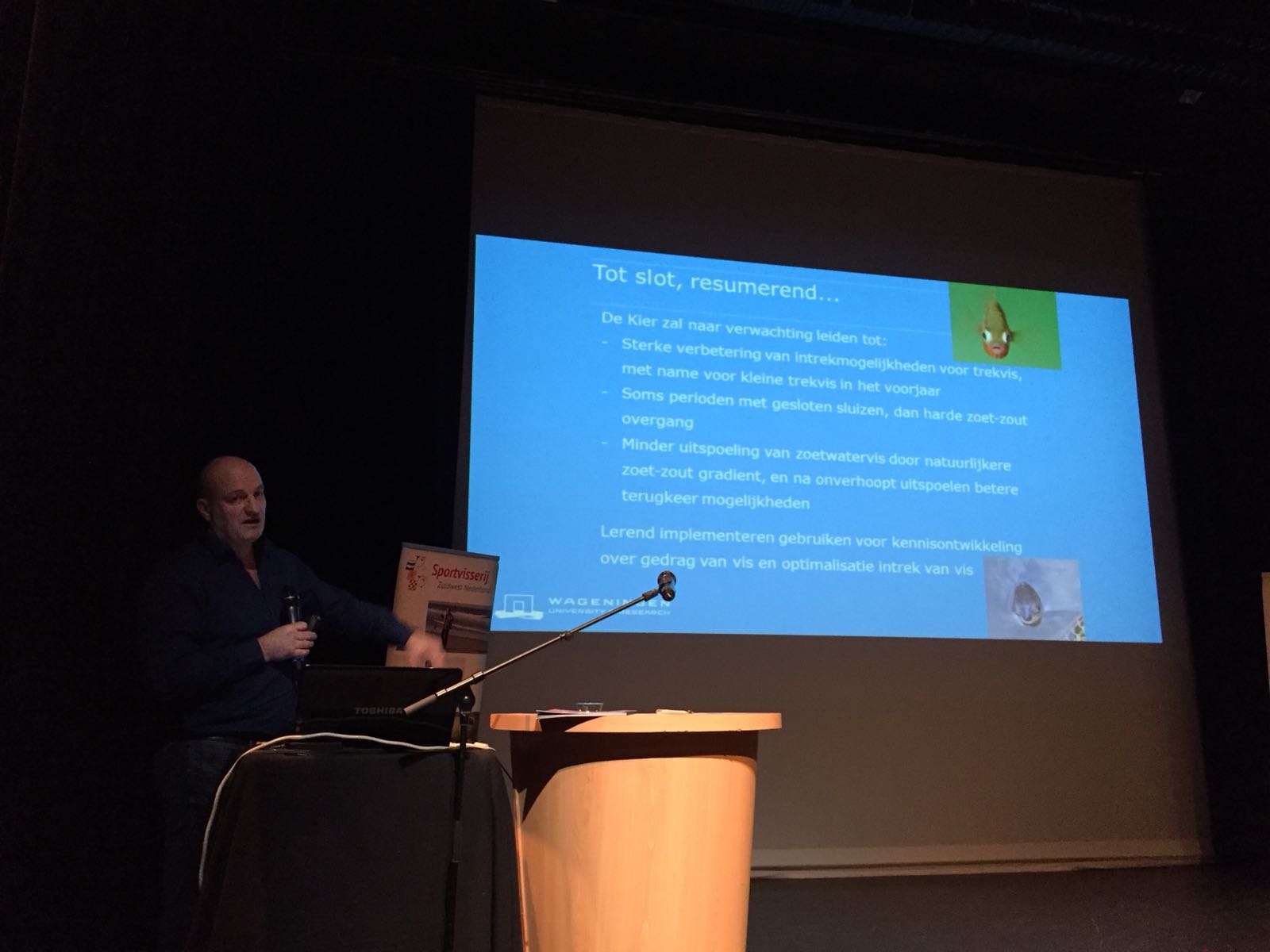 Koen Workel, omgevingsmanager bij Rijkswaterstaat, beet de spits af met een duidelijke presentatie over de werking van 'de kier'. Aan de hand van een korte film en een powerpoint presentatie liet hij zien hoe vanaf 2018 een natuurlijker overgang tussen zoet- en zoutwater er in de praktijk uit zal gaan zien. Vast staat dat Rijkswaterstaat voorzichtig van start zal gaan ('lerend implementeren') waardoor wordt voorkomen dat de opening van de sluis onvoorziene gevolgen zal hebben. Ook werd verteld hoe door 'de kier' het ongewenste uitspoelen van zoetwatervis kan worden voorkomen. Door de veel geleidelijker overgang van zoet naar zout water kunnen vissen namelijk meebewegen met het zoute water.
