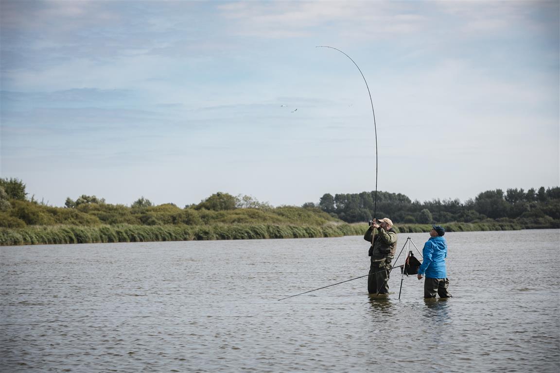 Wadend op de eerste stek zien ze al snel flink wat brasemstaarten het wateroppervlak doorbreken. Direct gaat er een handje witvisvoer richting de vissen en worden de opgetuigde matchhengels erbij gepakt. De dobbers schieten al na een paar minuten onder, maar het zijn vooral kleine windes en blankvoorns die het aas weten te vinden. Vlak voor hun voeten scharrelen weliswaar grote brasems rond, maar vermoedelijk zijn die volledig gefocust op muggenlarven in de modderbodem. Zelfs een smakelijke combi van wormen en maden wordt genegeerd.