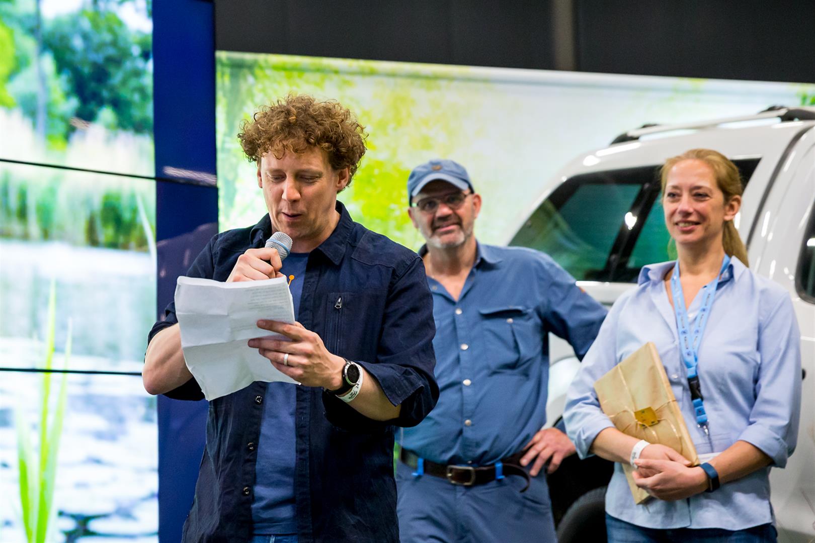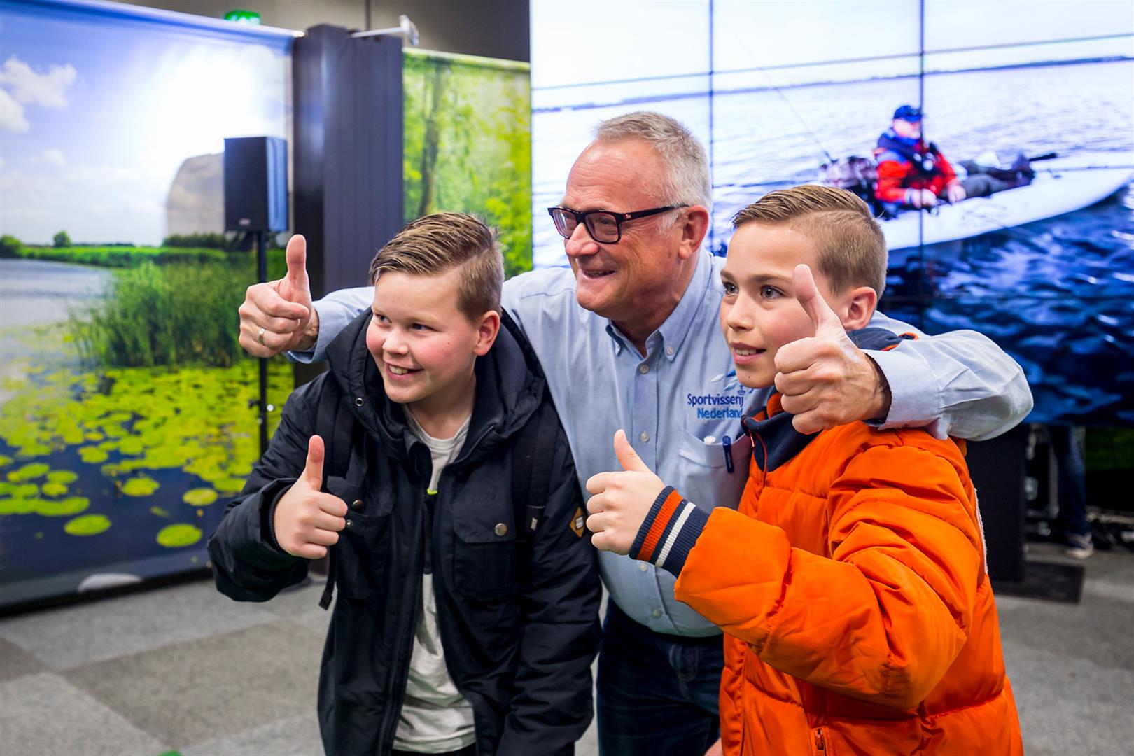 Zaterdagmiddag werd Ed bovendien verrast met een surprise act. Om 14.00 uur werd hij op het podium geroepen voor een officieel afscheid. Daarbij spraken diverse mensen lovende woorden richting de vertrekkend VIS TV-presentator. Dat begon met voorzitter Marjan van Kampen die Ed de gouden erespeld van Sportvisserij Nederland uitreikte voor zijn verdiensten voor de Nederlandse hengelsport – een zeldzame onderscheiding. Vervolgens verscheen cabaretier, visgek en ‘mystery guest’ Jochem Myjer ten tonele. Met een gedicht bracht hij een prachtige ode aan Ed.