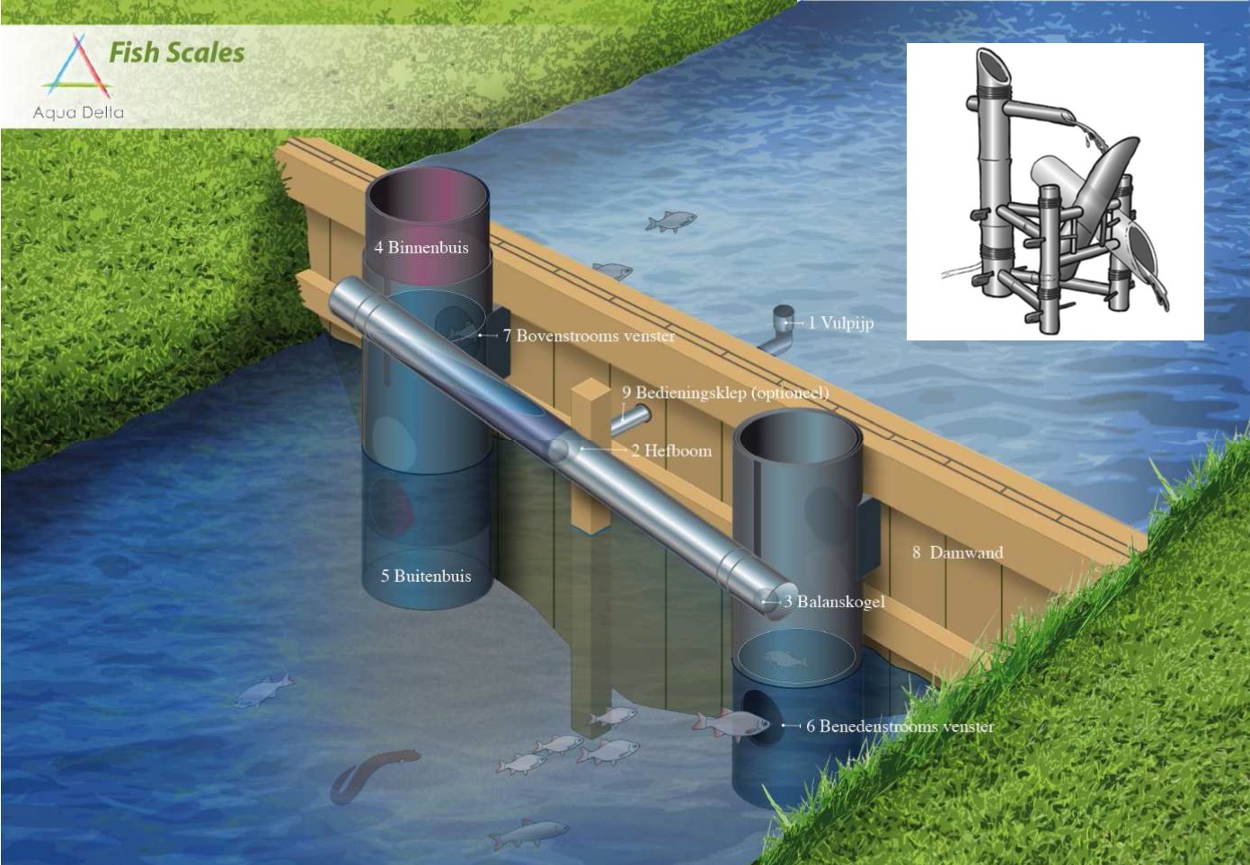 afsluiter. Deze laat gefaseerd water en vis in