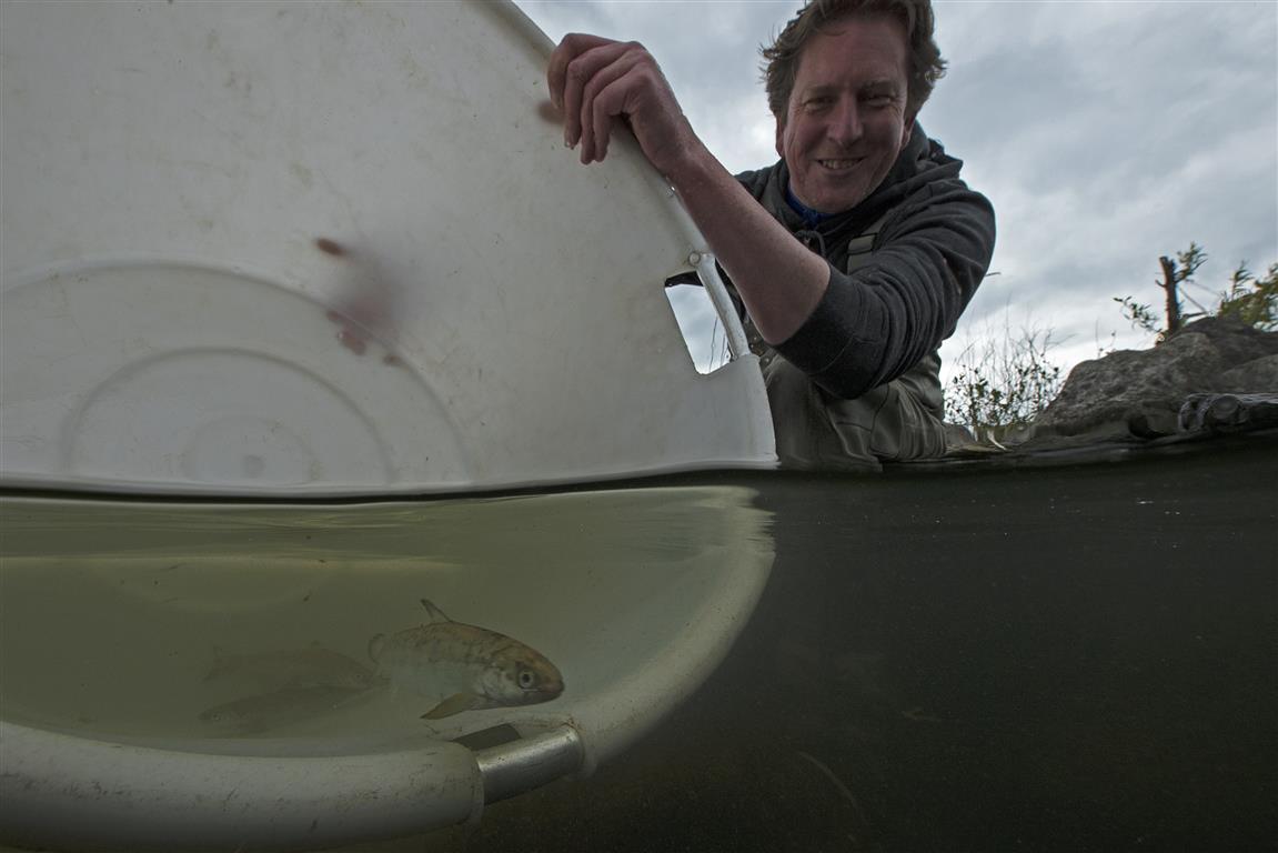 Uitzetten van jonge gezenderde zalmen. (video: Arthur de Bruin, Blikonderwater)