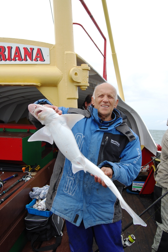 Nederland heeft de afgelopen maanden heel veel prima bootvisdagen gehad, maar juist op de dag van het Nederlands Kampioenschap was de wind naar het westen gedraaid en toegenomen tot krachtig. Omdat het grootste deel van de dag de wind tegen de getijdenstroming bokste, verhoogde dat het golfhoogte ook nog eens een keer. Toch heeft schipper Piet Hoogerwerf van het MS Maatje Adriana geprobeerd om de rijke visgronden rondom het Meerkerk gebied te bereiken. Halverwege moesten we met zijn allen constateren, dat het niet haalbaar was. Een valse start derhalve en de boot moest noodgedwongen terug en ankerde voor de Oosterscheldekering, waar de zee wat rustiger was. Daar werd de strijd uitgevochten met het vangen van haaien, zeebaars, schol en enkele botten.