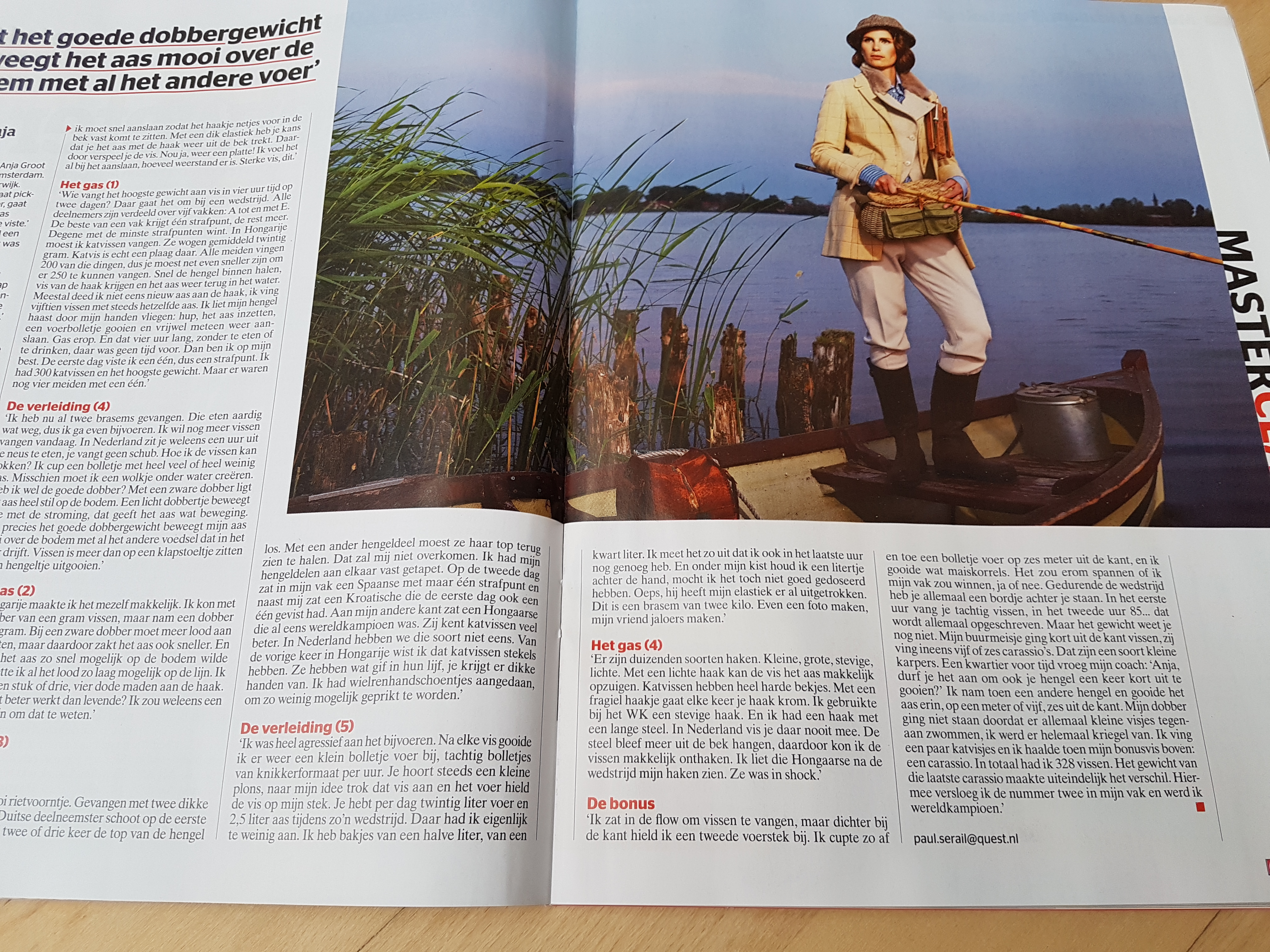 Tweevoudig wereldkampioen Anja Groot schittert deze maand in het populairwetenschappelijke tijdschrift Quest. In de vier pagina’s tellende rubriek Masterclass gaat ze tot in detail in op de kunst van het wedstrijdvissen en het afgelopen WK in Hongarije waar ze voor de tweede keer wereldkampioen werd.