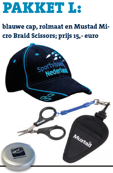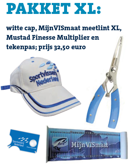 Het Extra Large pakket bevat de originele witte Sportvisserij Nedeland cap, het oprolbare MijnVISmaat meetlint XL, de praktische Mustad Finesse Multiplier en de handige tekenpas. Nu voor een totaalprijs van 32,50 euro, INCLUSIEF verzendkosten.