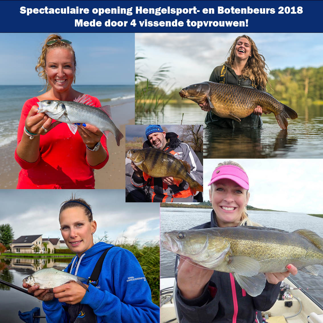 De Hengelsport- en Botenbeurs wordt spectaculair geopend door Marco Kraal en vier vissende topvrouwen Nathalie, Jasmijn, Lientje en Anja. De eerste 350 kinderen t/m 16 jaar krijgen een gratis Mitchell-hengel en een kilo Berlokvoer. Bestel