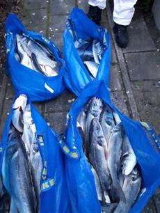 (foto: Wijkagent Henk, Twitter) In het Zeeuwse Oostburg is vannacht door de politie een man aangehouden die 81 zeebaarzen bij zich had. De vissen zaten in vier grote Ikea-tassen.