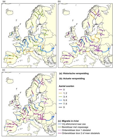 De grote rivieren van Europa met het aantal anadrome soorten, maximale migratieafstand, huidige migratiemogelijkheid indien het meest benedenstroomse obstakel wordt verwijderd.