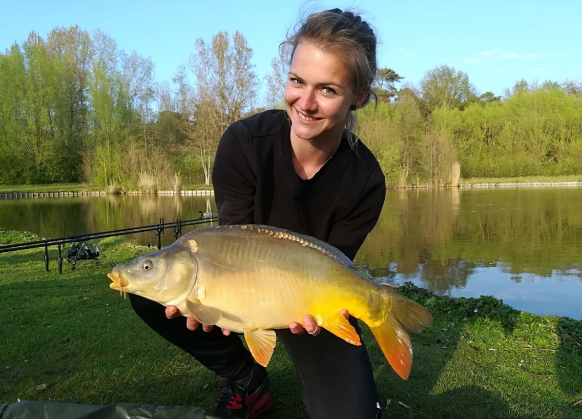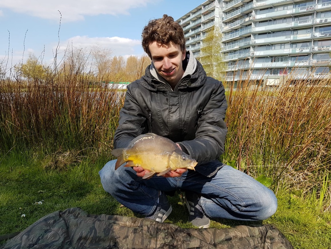 Ondanks het formaat is Lean Vellekoop erg blij met dit hoge spiegelkarpertje.