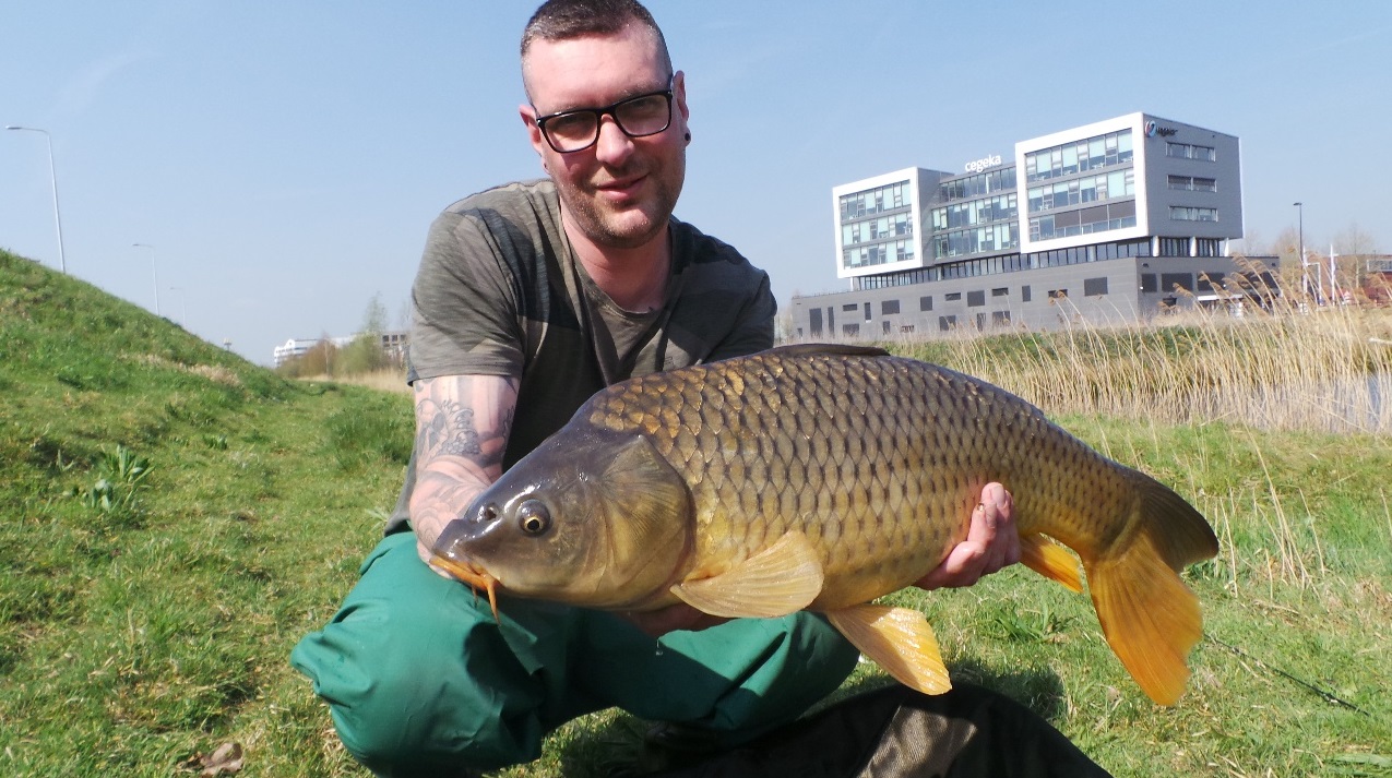 Bas Rothuizen showt hier een puntgave schub die hij ving in het voorjaarszonnetje.