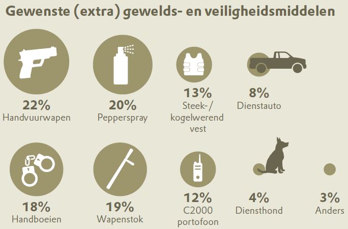 Die bijzondere omstandigheden zijn reden voor veel groene BOA’s om extra veiligheidsmiddelen te willen hebben. 47% van de respondenten vindt dat hij niet voldoende middelen tot zijn beschikking heeft om goed toezicht te kunnen uitvoeren en om de eigen veiligheid te kunnen waarborgen. Handvuurwapen, pepperspray, handboeien en wapenstok zijn de middelen waar het meeste behoefte aan is.