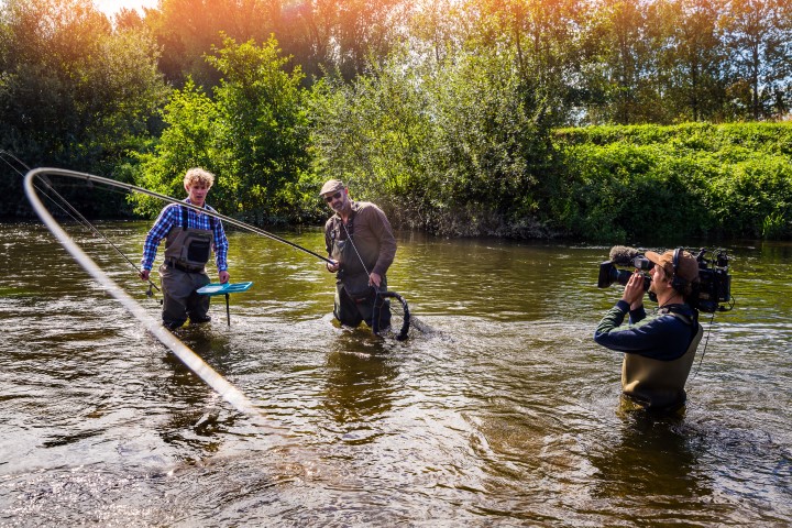 Voordat ze het water ingaan, speuren Marco en Daniël vanaf de oever naar stekken. Daar voeren ze steeds met beheerste worpjes een paar handen maden en casters. Een kudde jonge koeien kijkt toe terwijl de twee met waadpak het water instappen. Genietend van het schilderachtige landschap maken ze hun lijnen nat. De dobbers drijven tientallen meters weg.