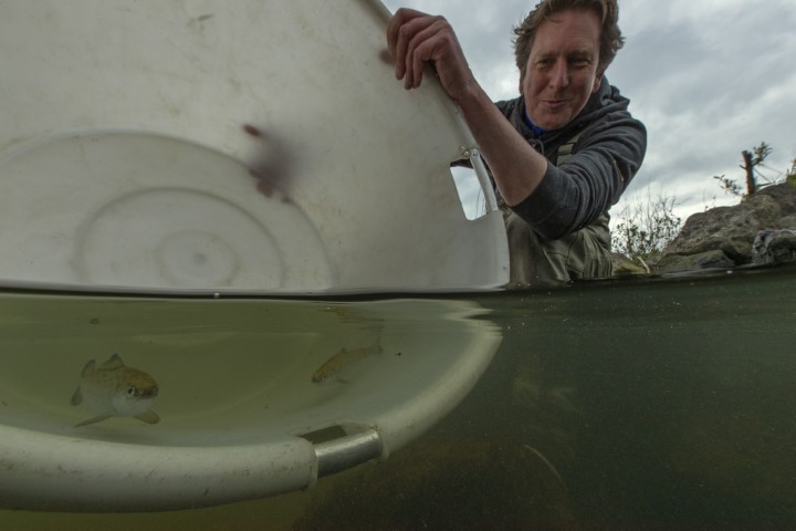 Uitzetten van jonge zalmen in de Rijn (Foto: Blik onder water).