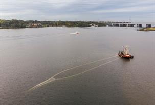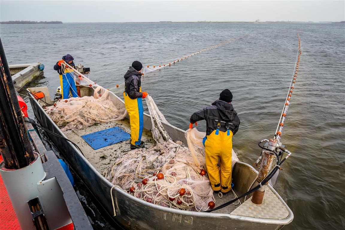 Beroepsvissers halen een net binnen tijdens het monitoringsonderzoek op de randmeren. Netwerk van hydrofoons
