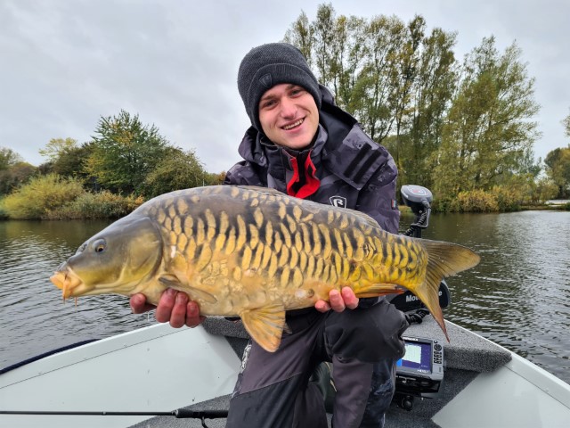 Tot zijn grote verbazing kwam even later deze schitterend beschubde spiegelkarper boven water! De shad was niet per ongeluk achter een vin blijven haken, maar zat duidelijk in de bek van de vis. Deze roofkarper was een heel bijzondere bijvangst, die na een paar plaatjes snel weer mocht zwemmen.