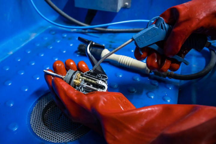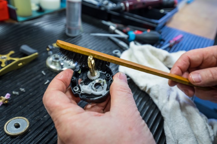 - De monteur neemt de molen onder handen: de spoel en slinger gaan eraf en de body gaat helemaal open om het binnenwerk schoon te maken. Overtollig vet en vuil worden verwijderd en alle delen worden ingesmeerd met de originele Shimano smeermiddelen die ook bij nieuwe producten die uit de fabriek komen worden gebruikt. Bij goedkeuring van de klant (zie stap drie hiervoor) worden de versleten onderdelen vervangen.