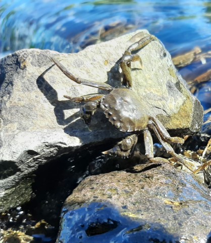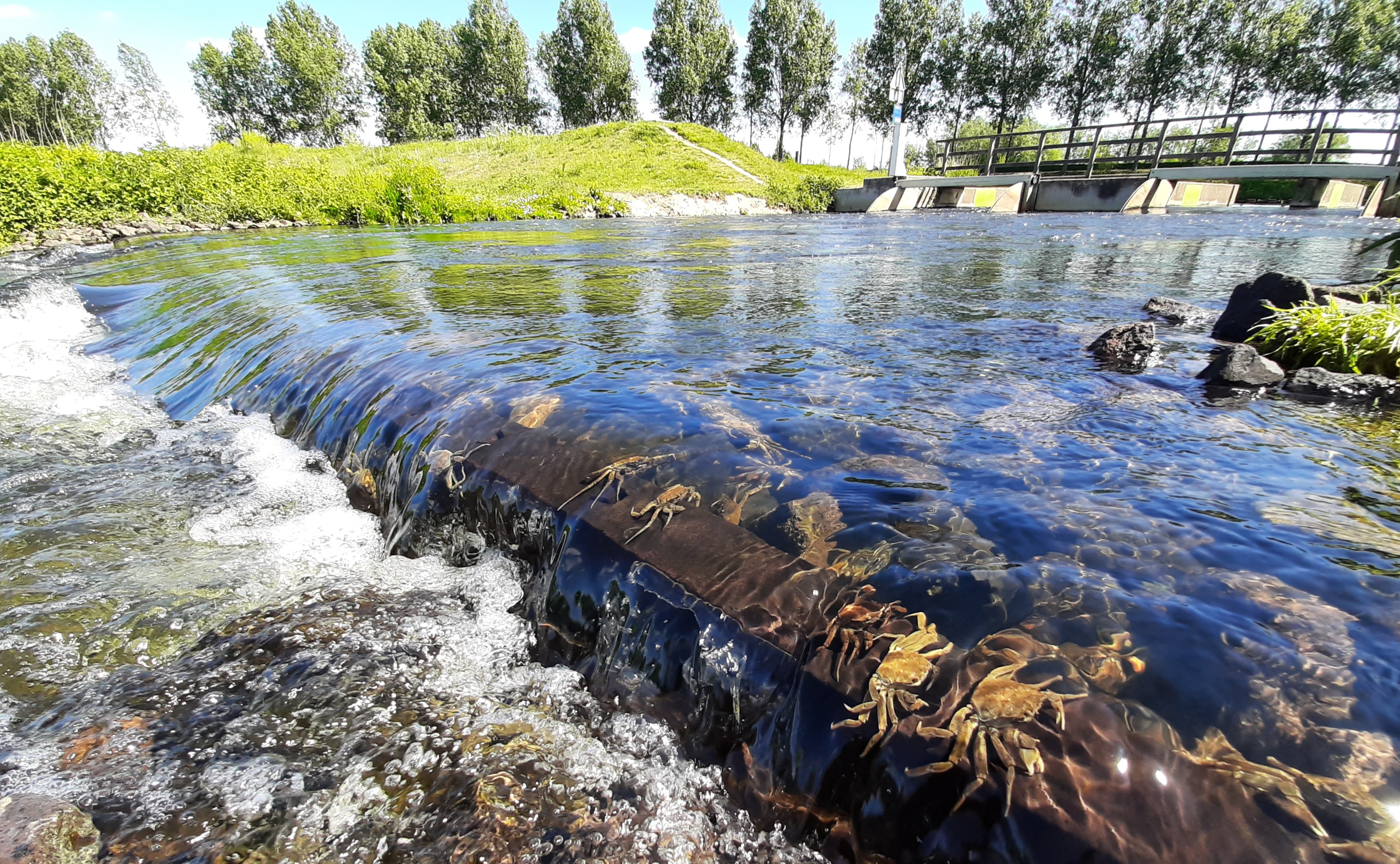 Waar de vismigratie redelijk onopvallend geschiedt, is hier tegelijkertijd een andere trektocht gaande; die van de Chinese wolhandkrab (Eriocheir sinensis). Overal zie je geelbruine tot donkerbruine krabben tussen de stenen van de mini-vismisgratierivier rondkruipen. En ze willen allemaal maar één kant op: stroomopwaarts.