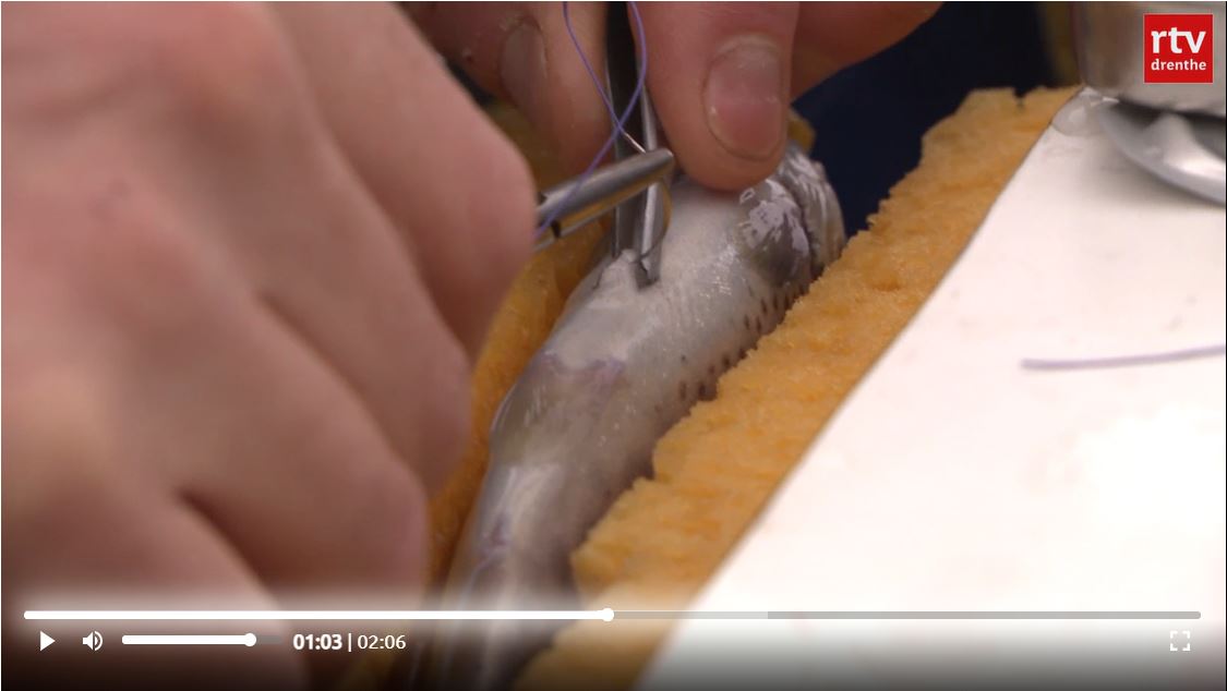 Foto: RTV Drenthe/Marc Ringenier. Marcus de Boer van Sportvisserij Nederland zet een chip in een van de forellen.