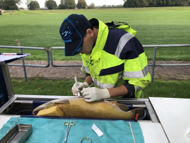 Onder verdoving worden de vissen voorzien van een zender. De overleving van deze vissen bedraagt 100 procent.