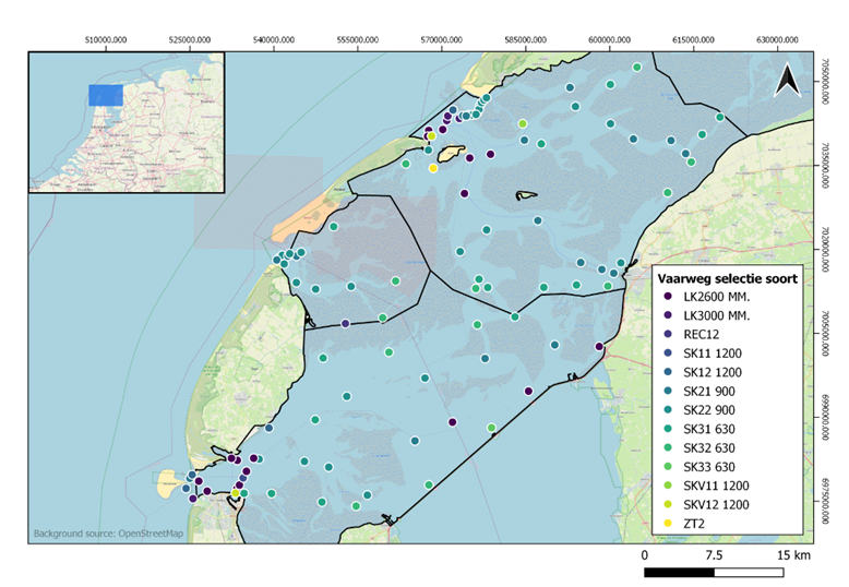 Overzicht van het antennenetwerk in het westelijk gedeelte van de Waddenzee.