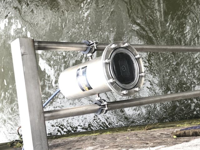 Met een onderwatercamera worden de wachtende vissen gefilmd. De beelden zijn te zien op de website Visdeurbel.nl. Onderzoek & monitoring