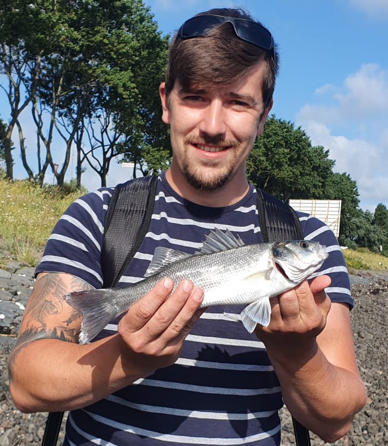 Deze leuke zeebaars ving Carlo van den Blink in de Nieuwe Waterweg en hij wint hiermee de Rock fishing bag.