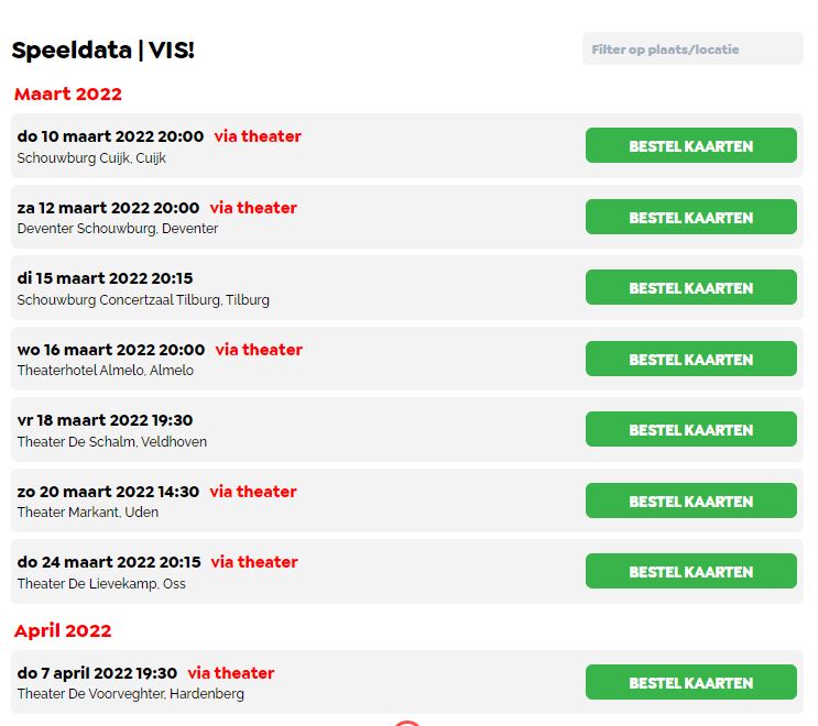 Kijk voor een overzicht van de speeldata in maart en april op ntk.nl. Daar kun je ook online tickets bestellen. Let op: het loont nog wel eens - als de site 'uitverkocht' aangeeft, om het theater zelf te bellen voor kaarten.