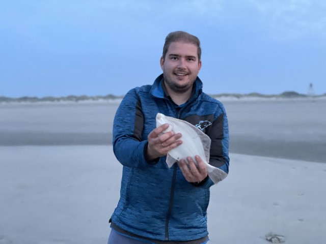 Vissend vanaf het Noordzeestrand op Ameland wist Patrick van Dijk in de schemering deze beste bot van 38 centimeter te vangen. De