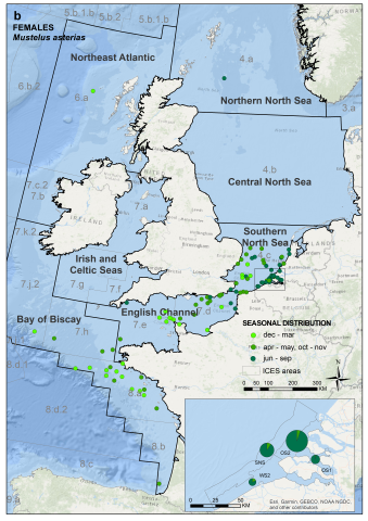 De afgelopen tien jaar heeft terugmelding van gemerkte haaien geleerd waar deze soort verblijft als ze in de herfst de Voordelta verlaten. Dit kaartje toont de terugmeldingen. De groene tint van elk bolletje laat zien in welke maand een haai is gevangen. Vooral vrouwtjes zwemmen in de wintermaanden zuidwaarts. Mogelijk versnelt warmer water de ontwikkeling van de jongen, die na een zwangerschap van ongeveer twaalf maanden worden geboren.