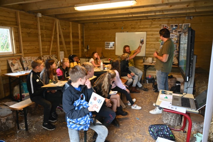 Meester Chris (achterin) geeft uitleg in het buitenlokaal.