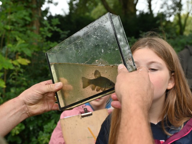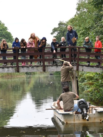 Bij de vijver herkennen de kinderen al verschillende vissoorten die Zweep uit het water schept. Op de vraag wat voor vis dit is, komt het antwoord snel: “Een snoek.” Zweep vangt ook blankvoorn, ruisvoorn, baars en zeelt en bij een Amerikaanse rivierkreeft vertelt hij over de invloed van exoten. Daarna mogen de kinderen vanuit de boot de dieren nameten en weer terugzetten. Schoolhoofd Venema is enthousiast: “Dit soort onderwijs gun je toch ieder schoolkind!”
