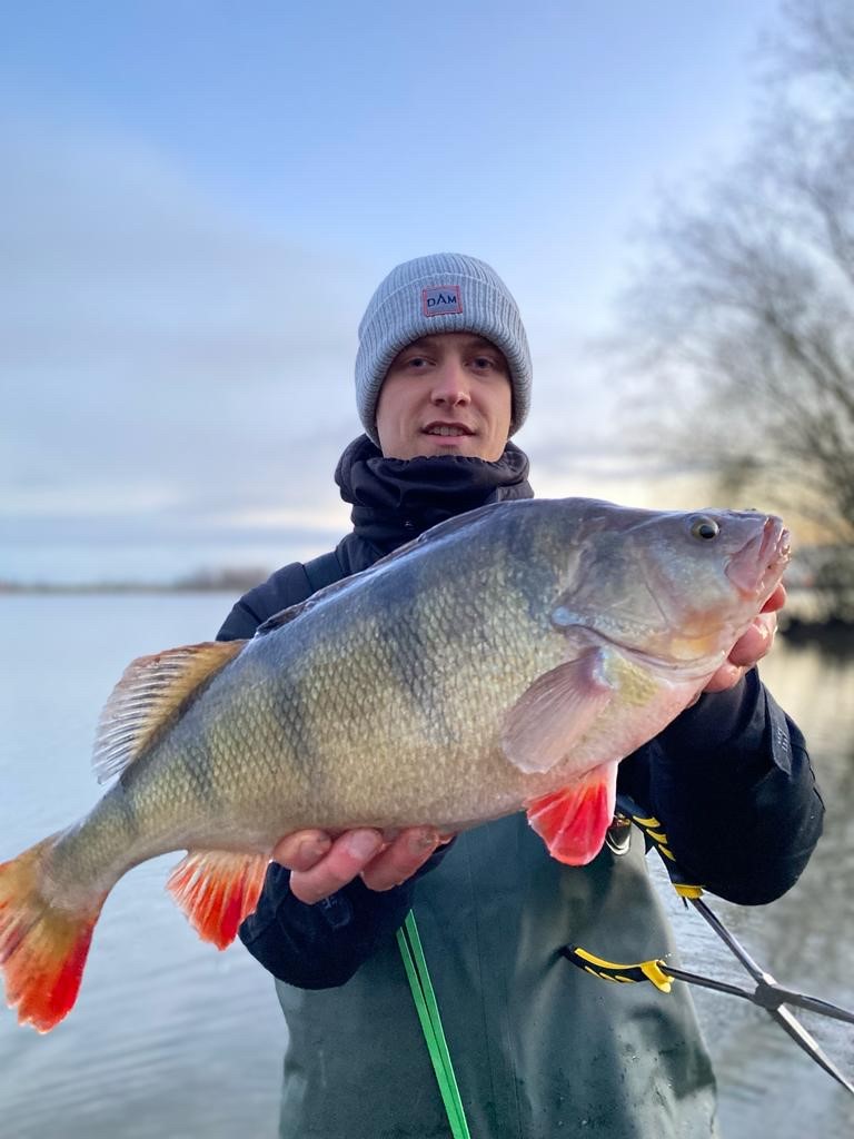 Traag gevist kunstaas kan in de wintermaanden ook niet echt happige vis toch tot een aanbeet verleiden. Willem Zorg kan erover meepraten. Op een rivierplas wist hij deze tank van een baars aan een op de Carolina rig gemonteerde shad te vangen.