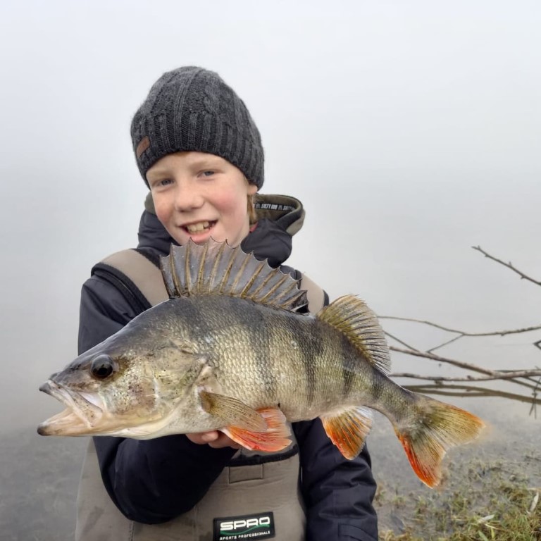 Baars:Op een mistige winterdag begin dit jaar trok Daniël Spijker er met de spinhengel op uit met als doel om een mooie baars te vangen. Heel traag aan de Carolina rig gevist kunstaas bracht deze beauty van 43 cm in het net. Missie geslaagd!