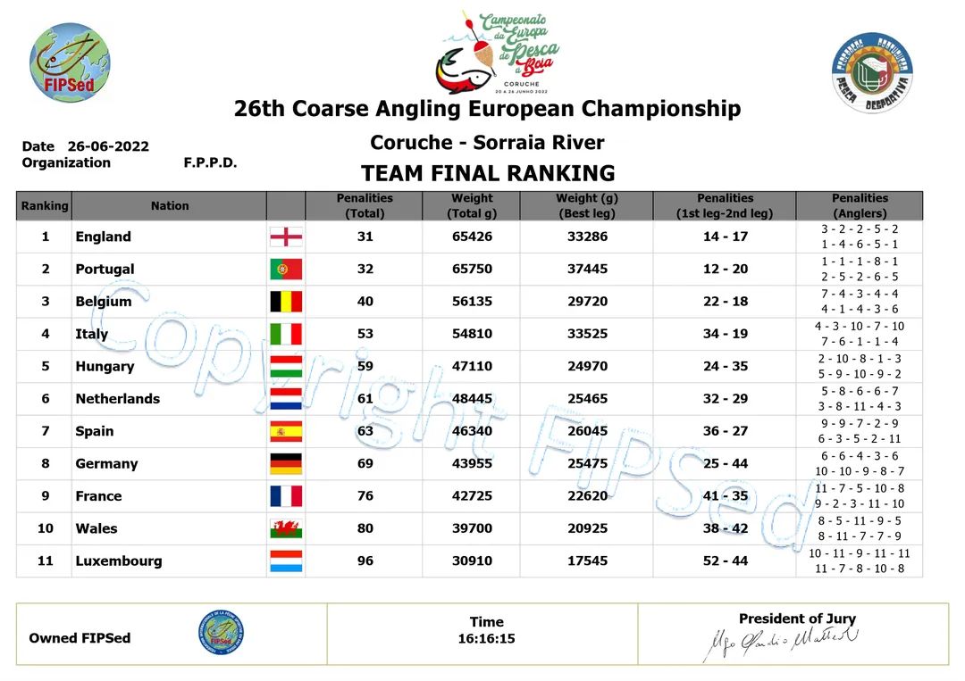 Fotografie: Vasco Emidio / Olho Negro FotografiaTeam Holland - dat na de eerste dag in het tussenklassement al op plek 6 stond - moest bij deze 26e editie van het EK Dobbervissen ook de teams van Italië (plek 4) en Hongarije (plek 5) voor zich dulden, maar hield Spanje, Duitsland, Frankrijk, Wales en Luxemburg wel onder zich. De 6e plek in het eindklassement is gezien het totale vangstgewicht (48.445 gram) en aantal penalties (61) van onze nationale ploeg ook een terechte uitslag. Ter illustratie: winnaar Engeland bracht in totaal 65.426 gram ter weging (31 penalties), en hekkensluiter Luxemburg op plek 11 moest het doen met 30.910 gram vis en 96 penalties.