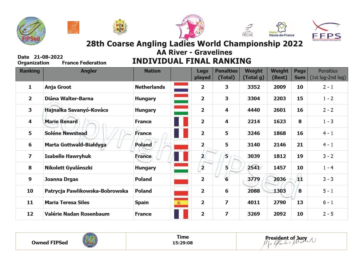 Anja Groot (34) is de nieuwe wereldkampioen zoetwatervissen bij de dames. Na een zinderende finale in het Franse Gravelines pakte ze gisteren met slechts 48 gram verschil het goud in het individueel klassement. Daarmee voegde ze alweer de vierde wereldtitel toe aan haar omvangrijke palmares.
