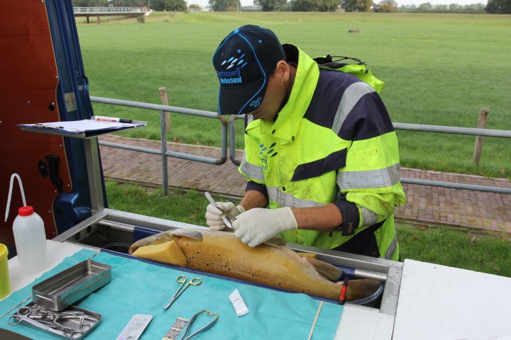 Een hiervoor gecertificeerde medewerker van Sportvisserij Nederland brengt een zender in bij een Atlantische forel.
