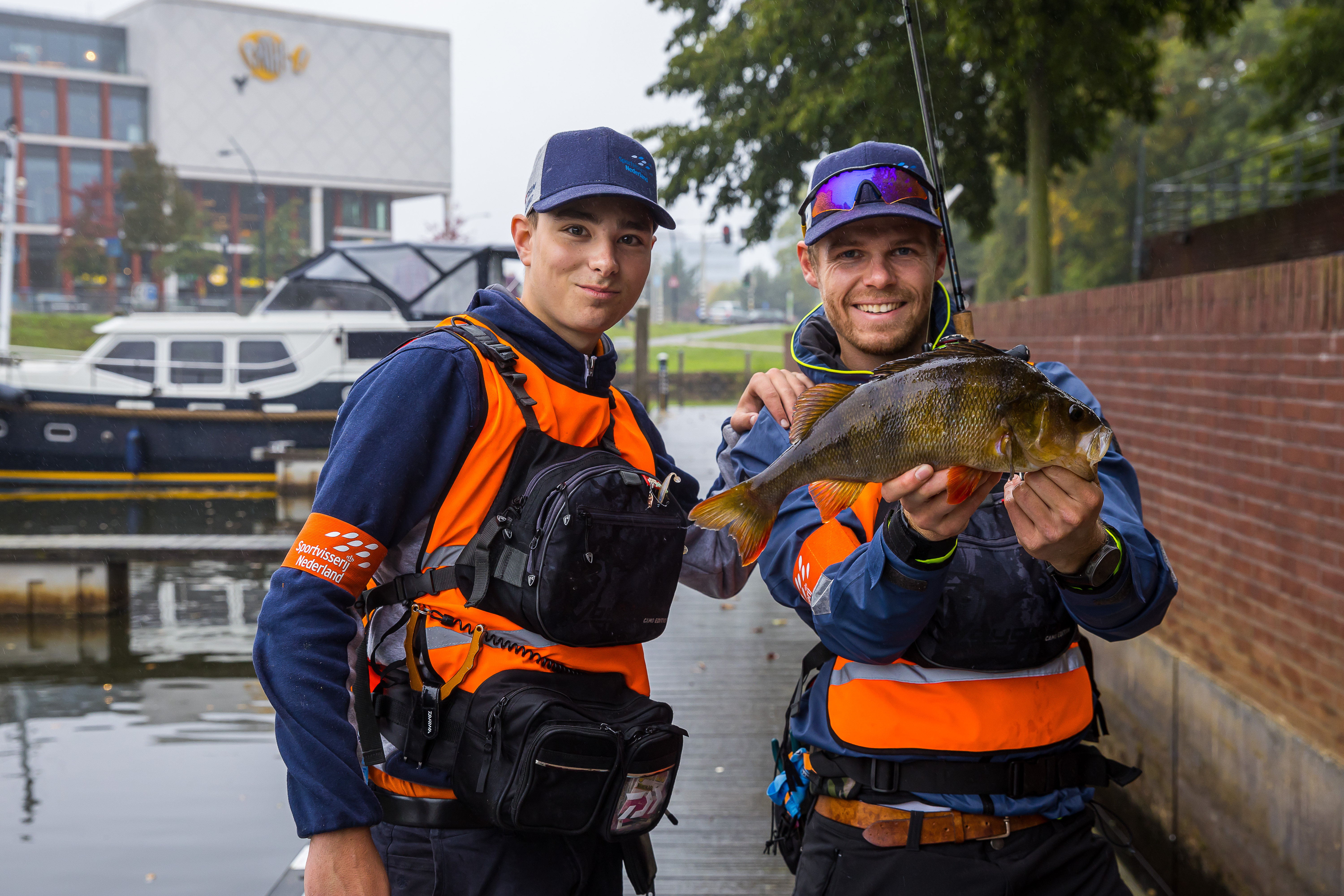 Gerben Jorritsma met koppelmaat Tim Kunst en de grootste baars (42 cm) van het WK.