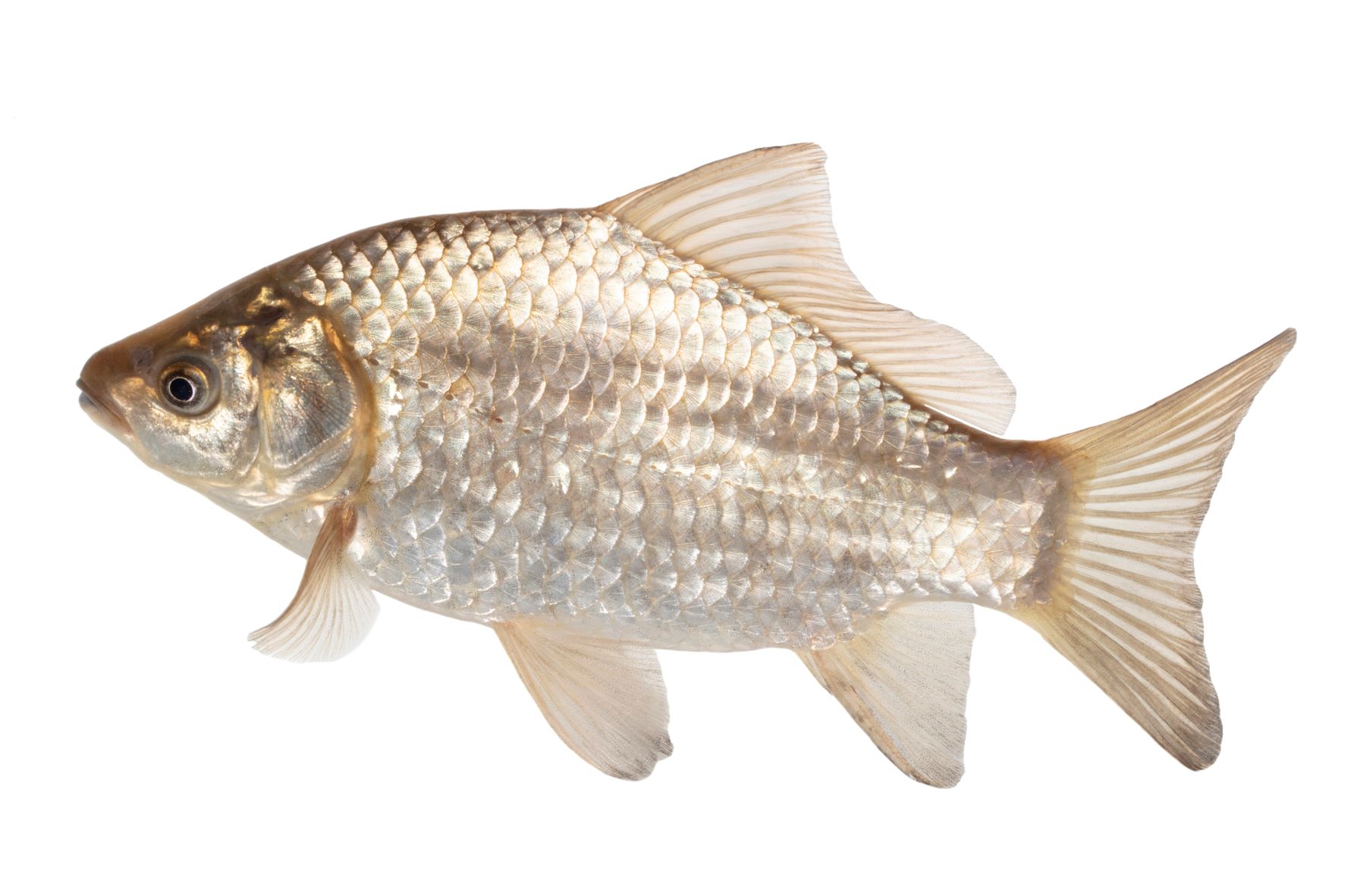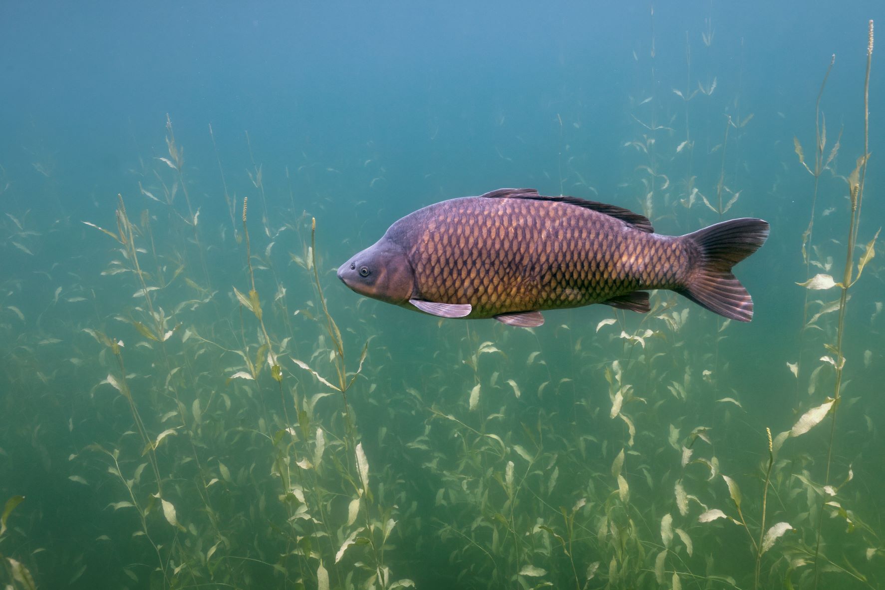 Een schubkarper is te herkennen aan de bekdraden en het regelmatige schubbenpatroon.