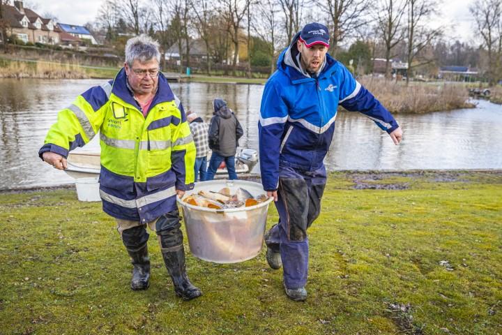 Met speciale teilen wordt de gevangen vis overgebracht naar de meetplaats.
