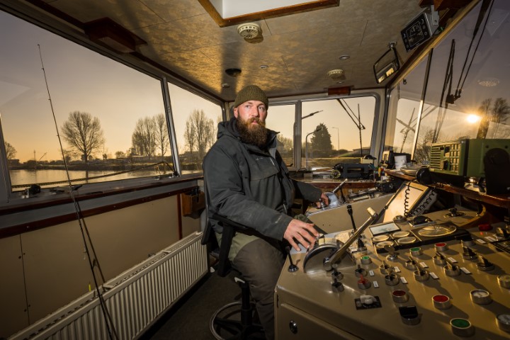 Vanuit de stuurhut heb je een prachtig, weids uitzicht op de Lek en de uiterwaarden. Ook passagiers genieten zichtbaar van het panorama. “Voor niet-vissers is het soms onbegrijpelijk dat we juist bij de pont vissen en niet een stukje verderop, in alle rust”, zegt Sander Pothuizen. Hij moet regelmatig aan passagiers uitleggen – nadat ze hem een praatje zien maken met een sportvisser – waarom we hier gaan staan.