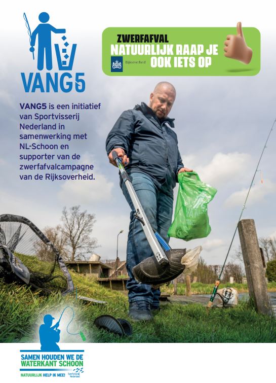 Daarom heeft Sportvisserij Nederland een paar jaar geleden de campagne ‘Vang 5’ gelanceerd. Daarin moedigen we sportvissers aan om tijdens het vissen vijf stuks afval (of 5 minuten) op te ruimen in en rond het water. Dat is een kleine moeite, maar een groot plezier. Het heeft ook een enorme impact: als elke sportvisser dit één keer per jaar doet scheelt dat maar liefst 10 miljoen stuks afval.