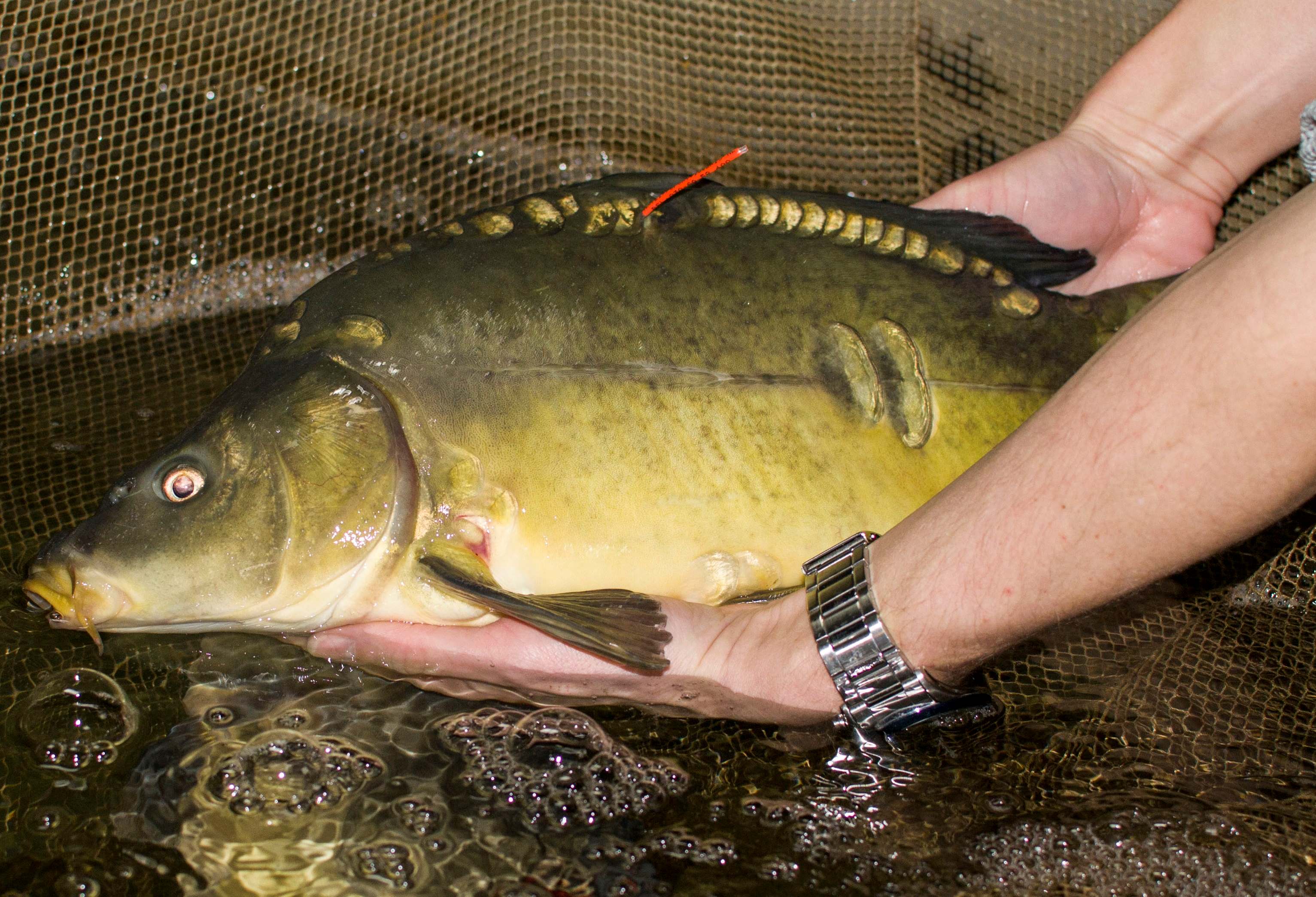 Karper met oranje tag vlak voor uitzet (niet dezelfde vis als hierboven)