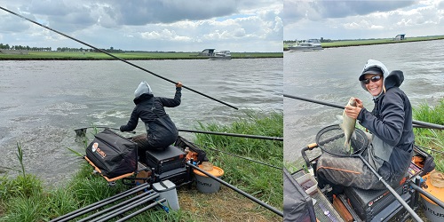 Wat betreft materiaal, aas en aanpak viste team Turbo Team met dobbermontages van 2, 3 en 4 gram drijfvermogen. “Het haakaas – muggenlarven en een combinatie van mestperen en muggenlarven scoorden het beste – visten we tussen de tien en veertig centimeter plat op de bodem”, laat Groot weten, die zelf 10/00 en 11/00 onderlijnen gebruikte in combinatie met een maatje 18 haak. Als bovenlijn koos ze voor 13/00. “Daarnaast was het belangrijk om regelmatig bij te cuppen.”